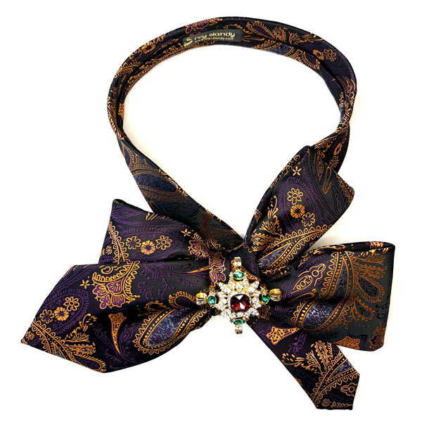 Oversized paisleys swirl in an amazing color combination of purple and gold accentuated by a big crystal cross brooch. The Bow necktie is ready to wear; it is very easy to put on and does not require tying. It secures with a magnet clasp.