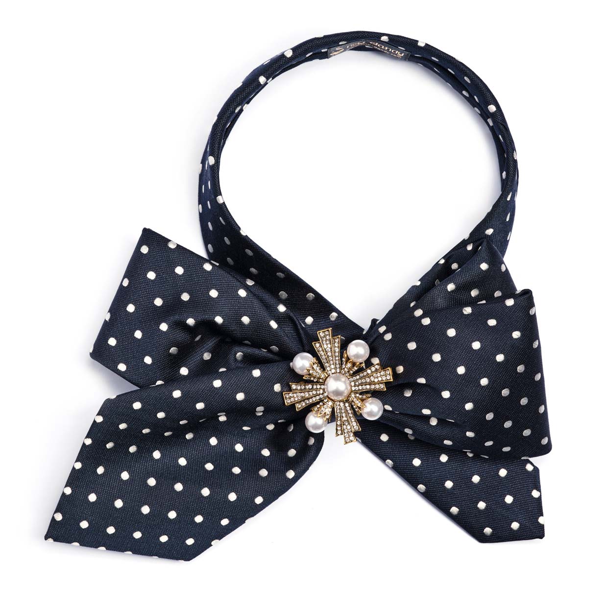 A sharp dot design in navy blue elevates a handsome silk Bow necktie. It is accentuated with a baroque crystal cross pearl brooch. The Bow necktie is made from a men’s silk tie, meticulously tied up and hand stitched. It is ready to wear; it is very easy to put on and does not require tying. It secures with a magnet clasp.