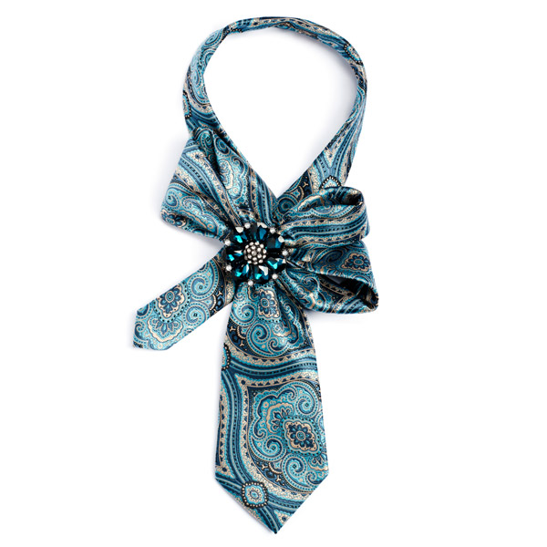 A rich nude and blue floral pattern brings texture and dimension to this beautiful silk-jacquard Ascot necktie. It is enhanced with a vintage-style petrol flower brooch. The Ascot necktie is ready to wear; it is very easy to put on and does not require tying. It secures with a magnet clasp.
