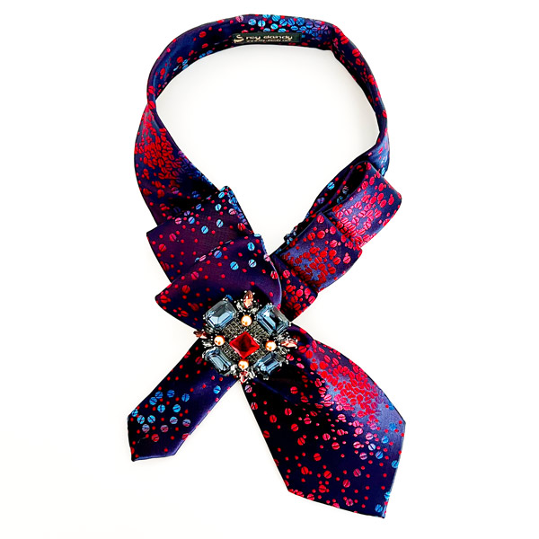 Embroidered modern pattern in blue and red colors adorns a refined Pleated necktie made from silk. It is beautifully complemented by a crystals cross brooch. The Pleated necktie is made from a men’s silk tie, meticulously pleated and hand stitched. It is ready to wear; it is very easy to put on and does not require tying. It secures with a magnet clasp.