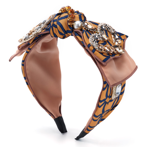 An exaggerated extra-wide headband features a combination of geometric and monochrome fabrics in a palette of honey and blue. It’s decorated with statement rhinestone hearts and pearls, making it a bold and stylish accessory.