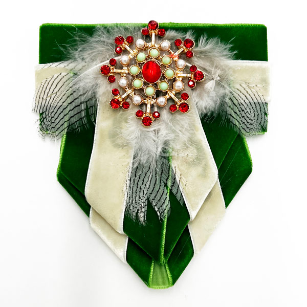Meticulously crafted with attention to detail, this brooch is made of green and off white velvet ribbons and statement rhinestone cross ensures both durability and an exquisite finish. It’s a testament to quality craftsmanship that you can wear with pride.