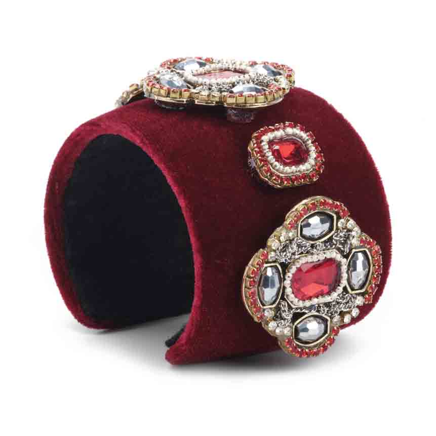 Step into the world of historical elegance with this meticulously crafted metal cuff bracelet lined with deep red velvet fabric and decorated with sparkling medallions. It’s a regal and opulent accessory that adds a touch of grandeur to your ensemble.