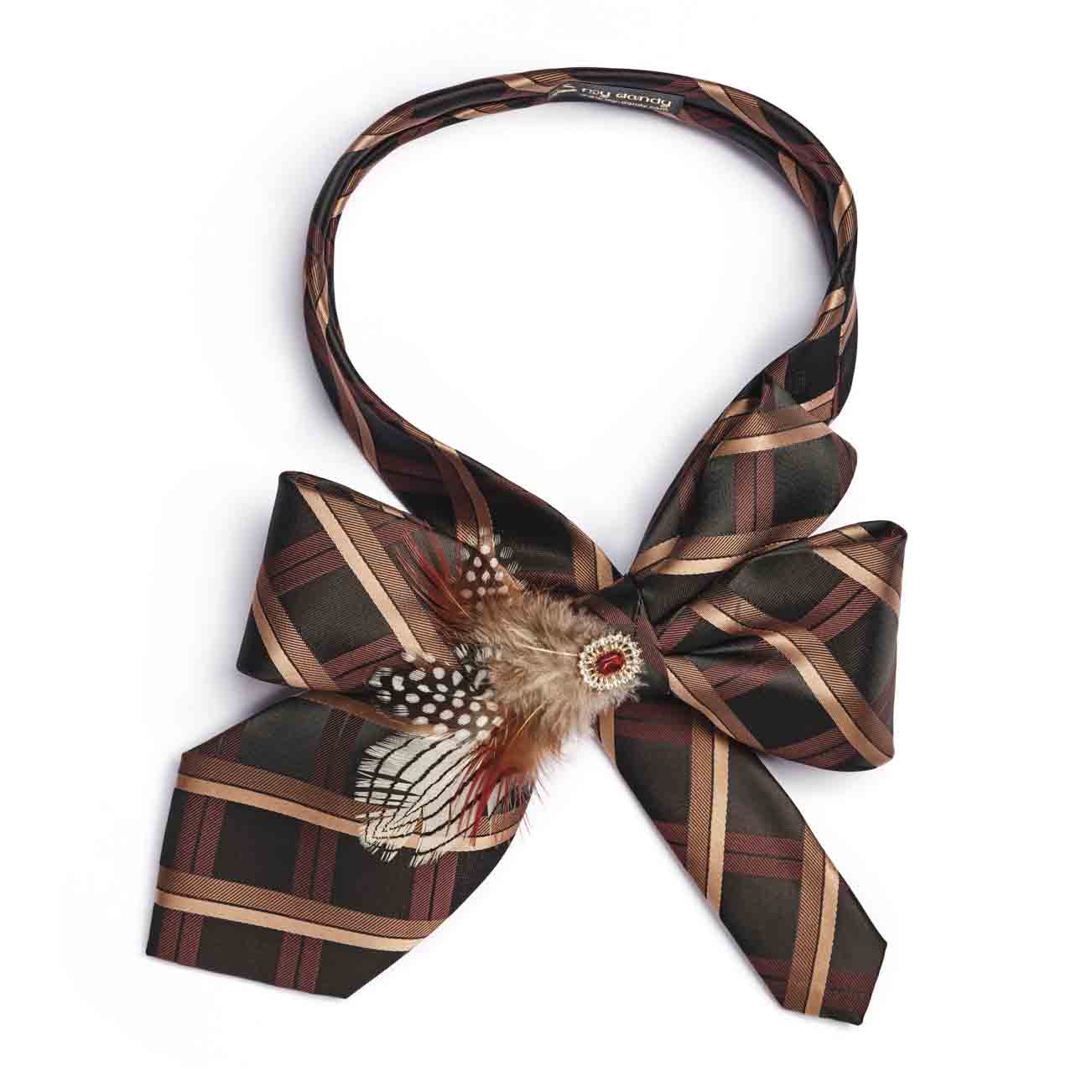 Distinguished brown scale checks detail a classic silk Bow necktie, adorned with natural pheasant feathers and a red rectangle glass rhinestone. The Bow necktie is made from a men’s silk tie, meticulously tied up and hand stitched. It is ready to wear; it is very easy to put on and does not require tying. It secures with a magnet clasp.