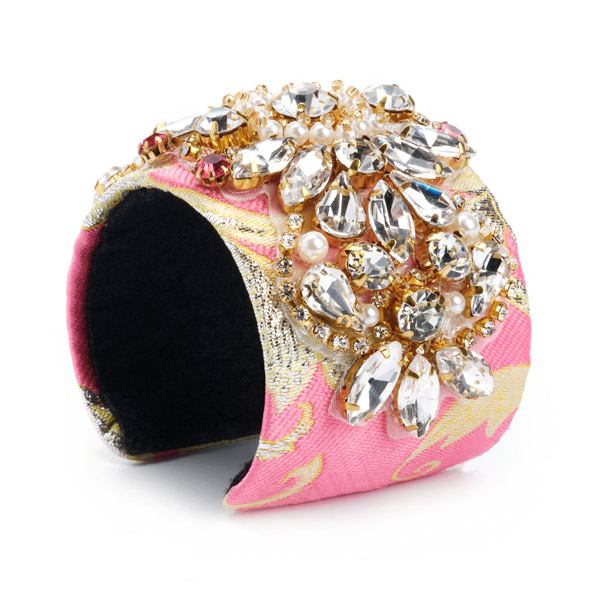 Let your wrist shine with the extravagance and beauty of this Baroque metal cuff bracelet lined with brocade fabric made of gold-pink silk, decorated with sparkling rhinestones. It’s a luxurious and opulent accessory that adds a touch of grandeur to your look.