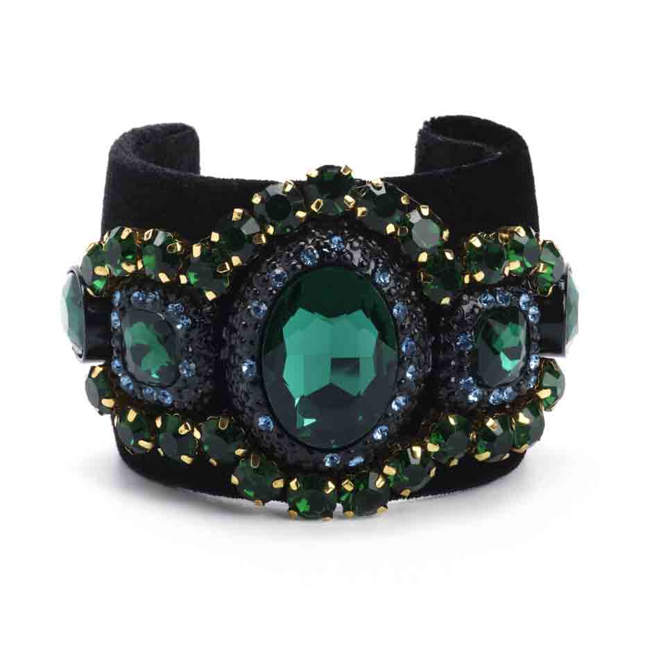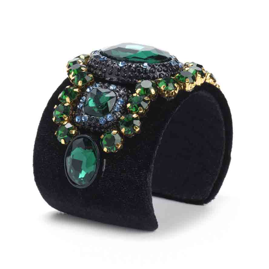 Adorn your wrist with this intricately designed Baroque metal cuff bracelet, lined with black velvet fabric and decorated with emerald sparkling rhinestones. It’s a luxurious and stylish accessory that adds a touch of opulence to your ensemble.