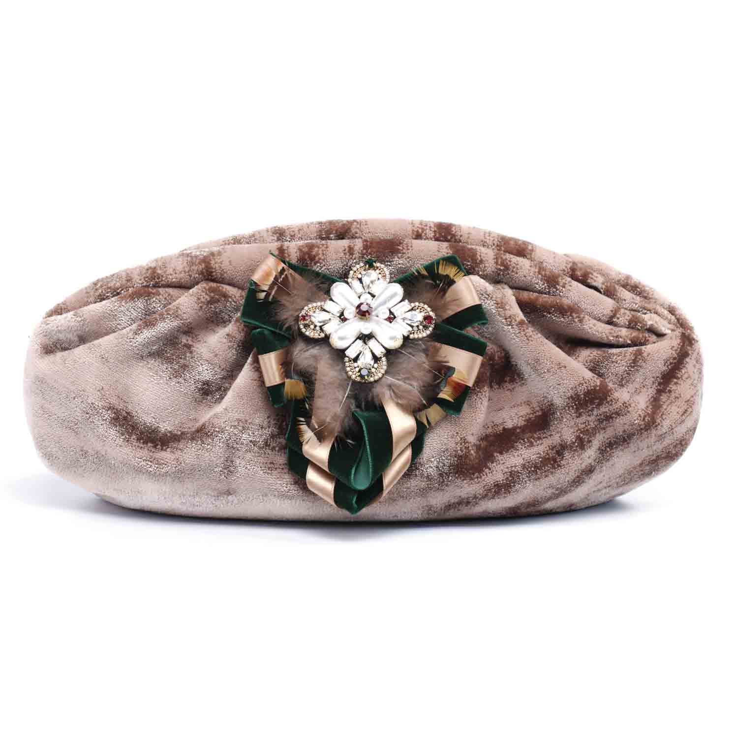 Indulge in opulence with our puffy bag, adorned with an exquisite brooch detail made of pearls, glass, rhinestones, peacock feathers, satin and velvet ribbons. The brown lining with two pockets inside the bag not only provides a stark contrast to the exterior but also ensures the protection and organization of your items. The inclusion of two pockets is practical and convenient, allowing for better organization of your items, such as your phone, keys or makeup. The zip closure ensures the security of your belongings while maintaining a distinguished look, making it a luxurious accessory that exudes elegance and sophistication.