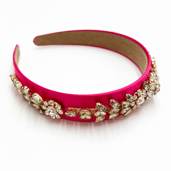 A gorgeous fuchsia satin headband adorned with silver and gold rhinestones provides a polished finish that shimmers beautifully as your head moves.