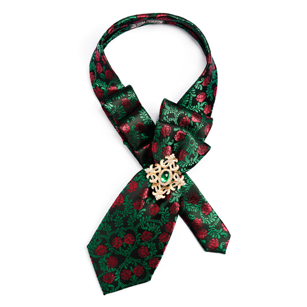 Embroidered roses bloom neatly on a Pleated necktie crafted from polished silk, elevating any look that’s on the festive side of formal. It is adorned with a vintage-style emerald rhinestone cross brooch. The Pleated necktie is made from a men’s silk tie, meticulously pleated and hand stitched. It is ready to wear; it is very easy to put on and does not require tying. It secures with a magnet clasp.