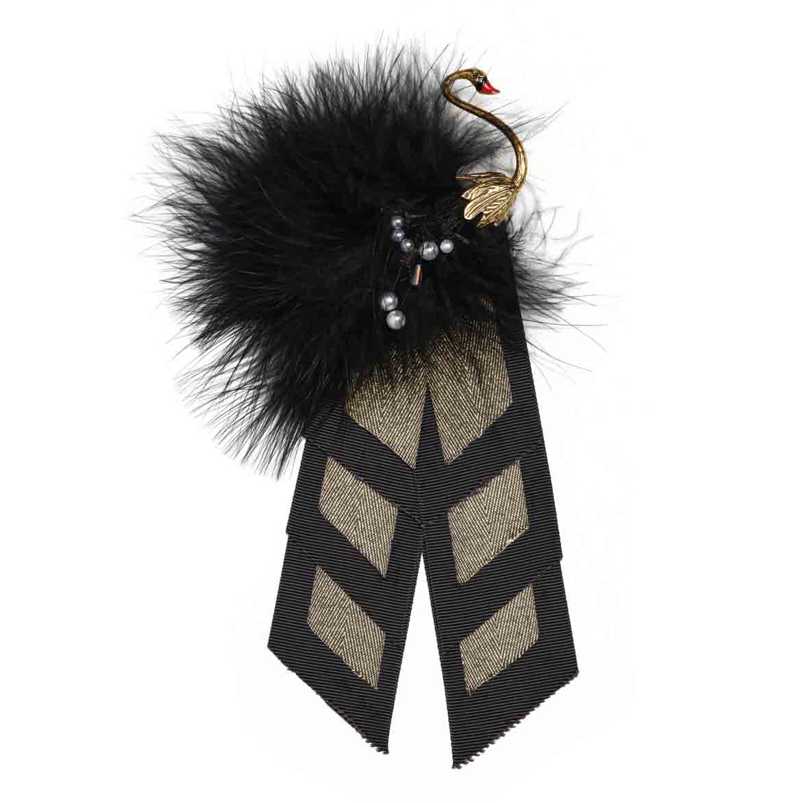 A modern ostrich feather brooch, designed with black and gold grosgrain ribbons, adds a touch of elegance and sophistication to your attire. The combination of feathers and ribbons creates a stylish and eye-catching accessory that can complement various outfits, whether for formal events or special occasions. The black and gold color scheme adds a sense of luxury and timeless appeal to the brooch.