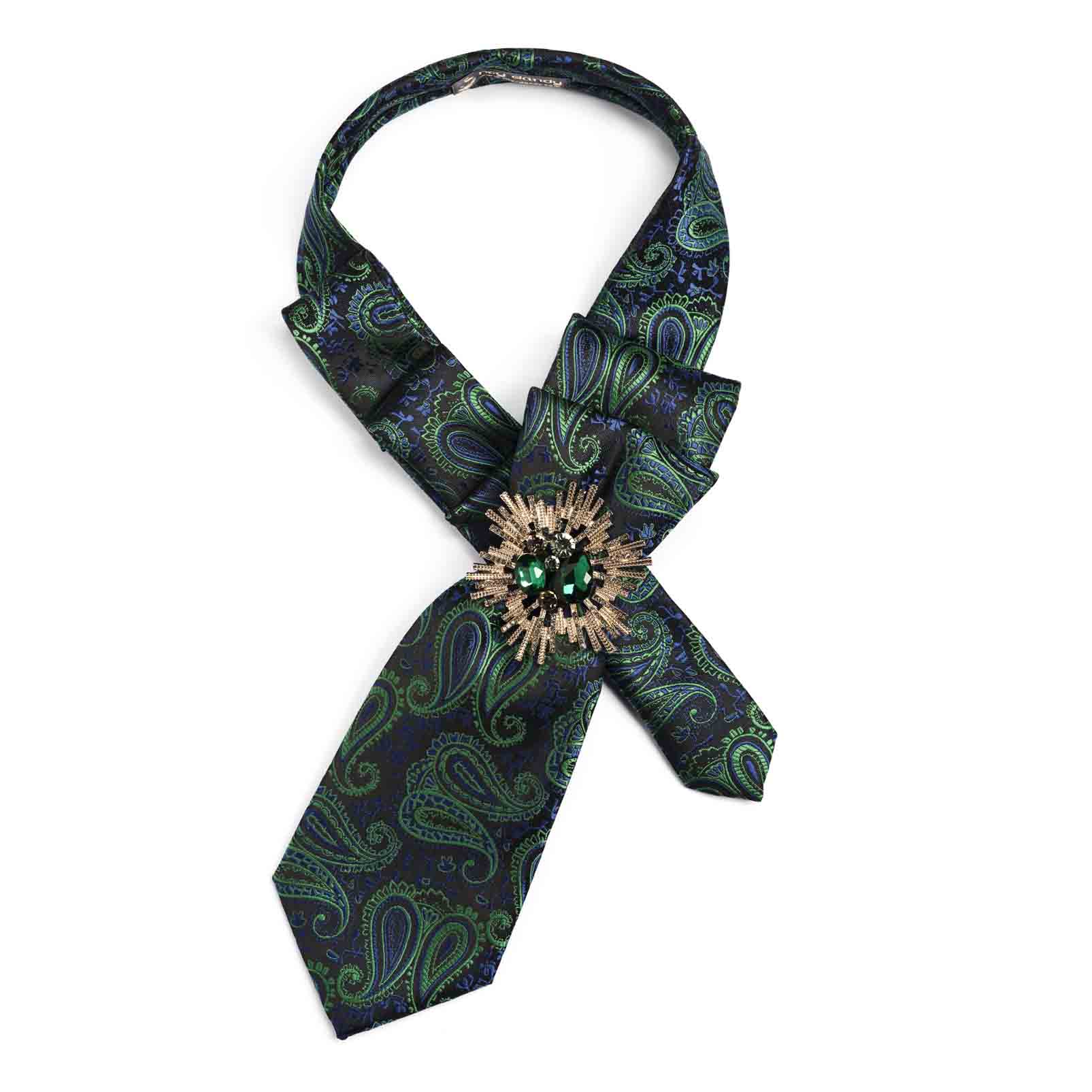 Embroidered paisleys pattern in green and blue colors adorns a refined Pleated necktie made from silk. It is beautifully complemented by a vintage-style emerald flower geometric brooch. The Pleated necktie is made from a men’s silk tie, meticulously pleated and hand stitched. It is ready to wear; it is very easy to put on and does not require tying. It secures with a magnet clasp.