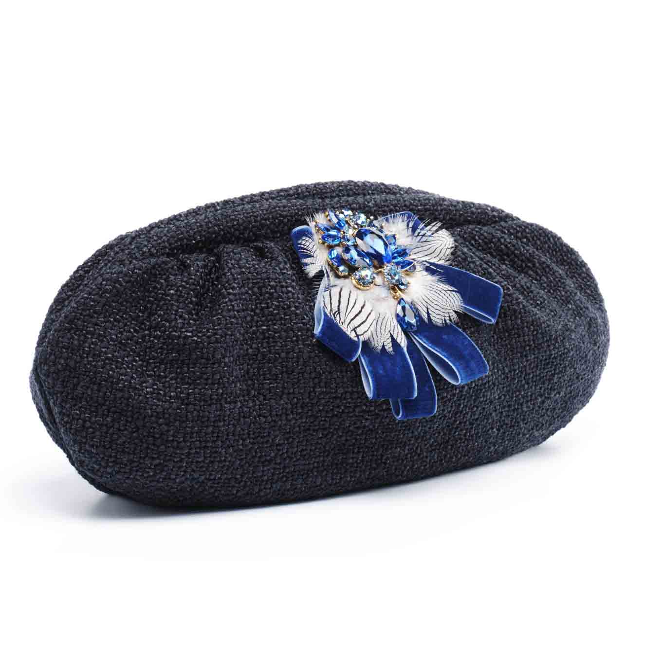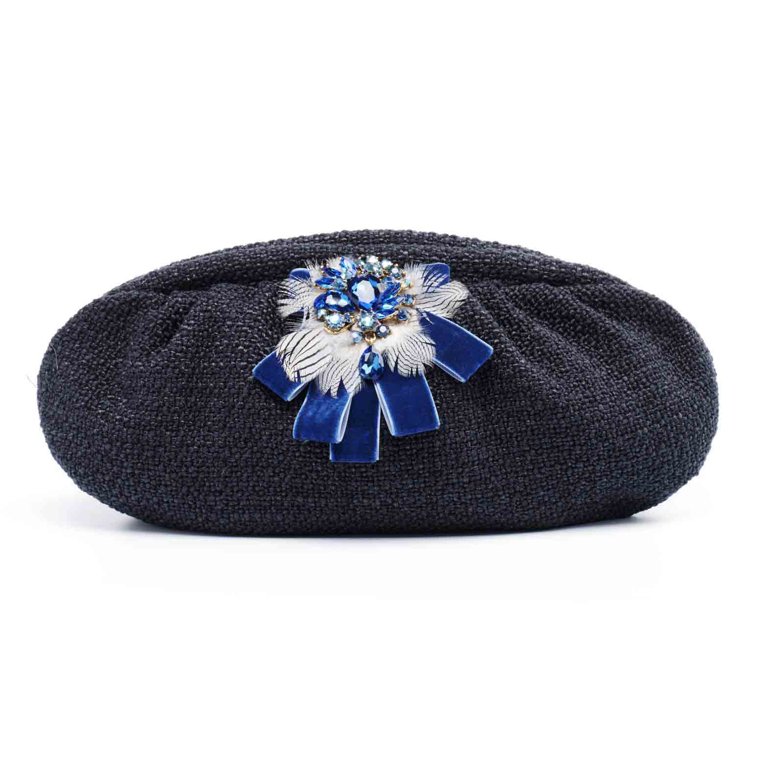 The epitome of timeless fashion, this night blue tweed puffy bag is adorned with a vintage sapphire rhinestone brooch, royal blue velvet ribbons and peacock feathers. The black lining inside the bag offers a perfect balance of fashion and functionality. The bag not only serves as a stylish accessory but also ensures that your items are well-protected and easily accessible. The zip closure ensures the security of your belongings while maintaining a chic and sophisticated look.
