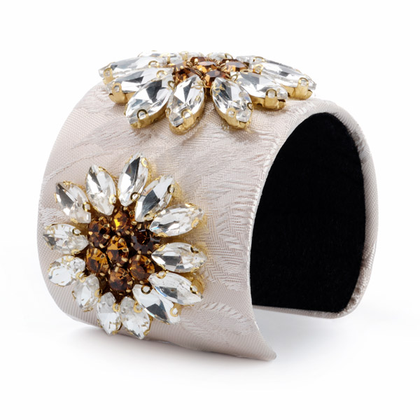 Lined with brocade fabric made of cream silk and decorated with sparkling rhinestones, this Baroque metal cuff bracelet embodies the grandeur and ornate beauty of a bygone era. It’s a stunning accessory that exudes opulence and sophistication.