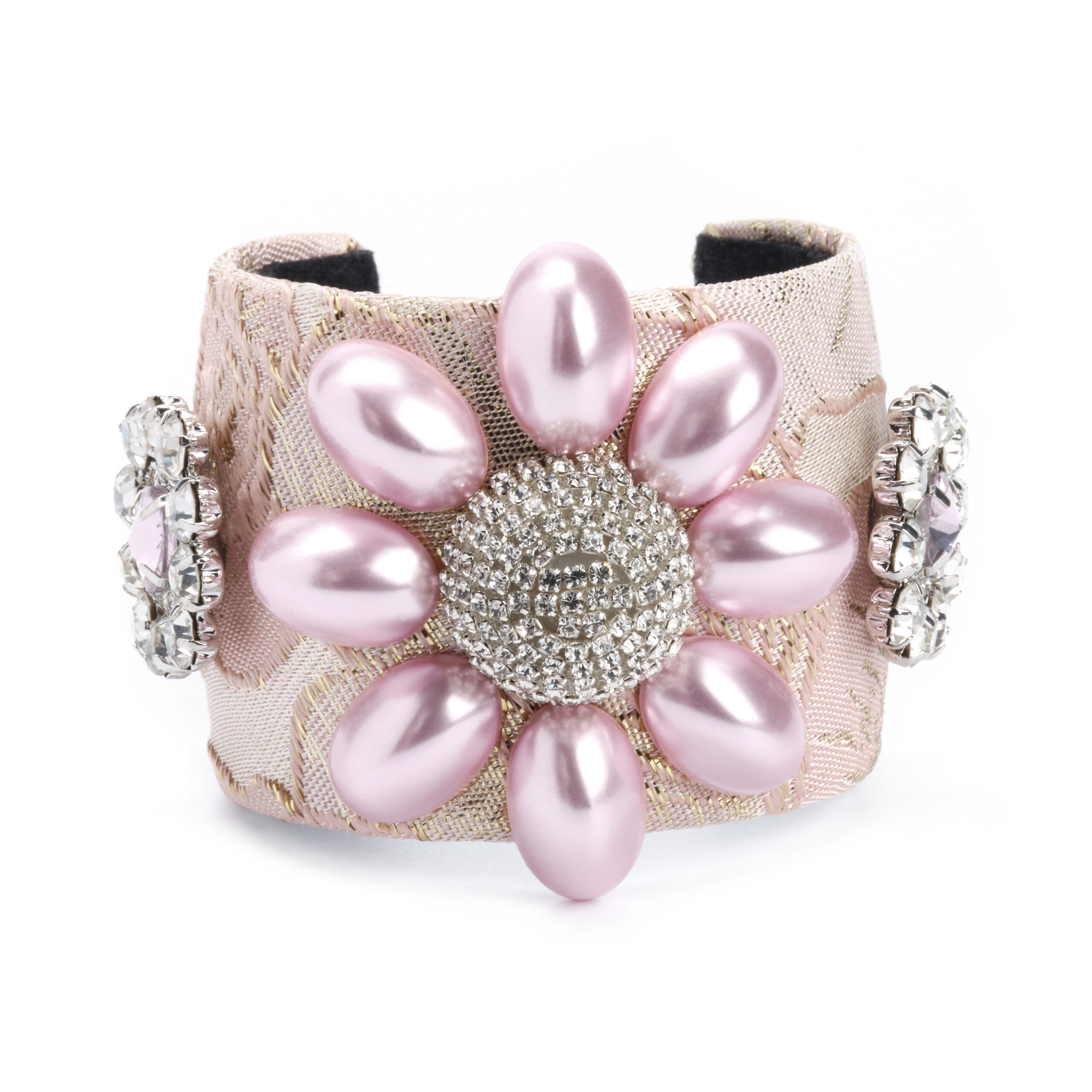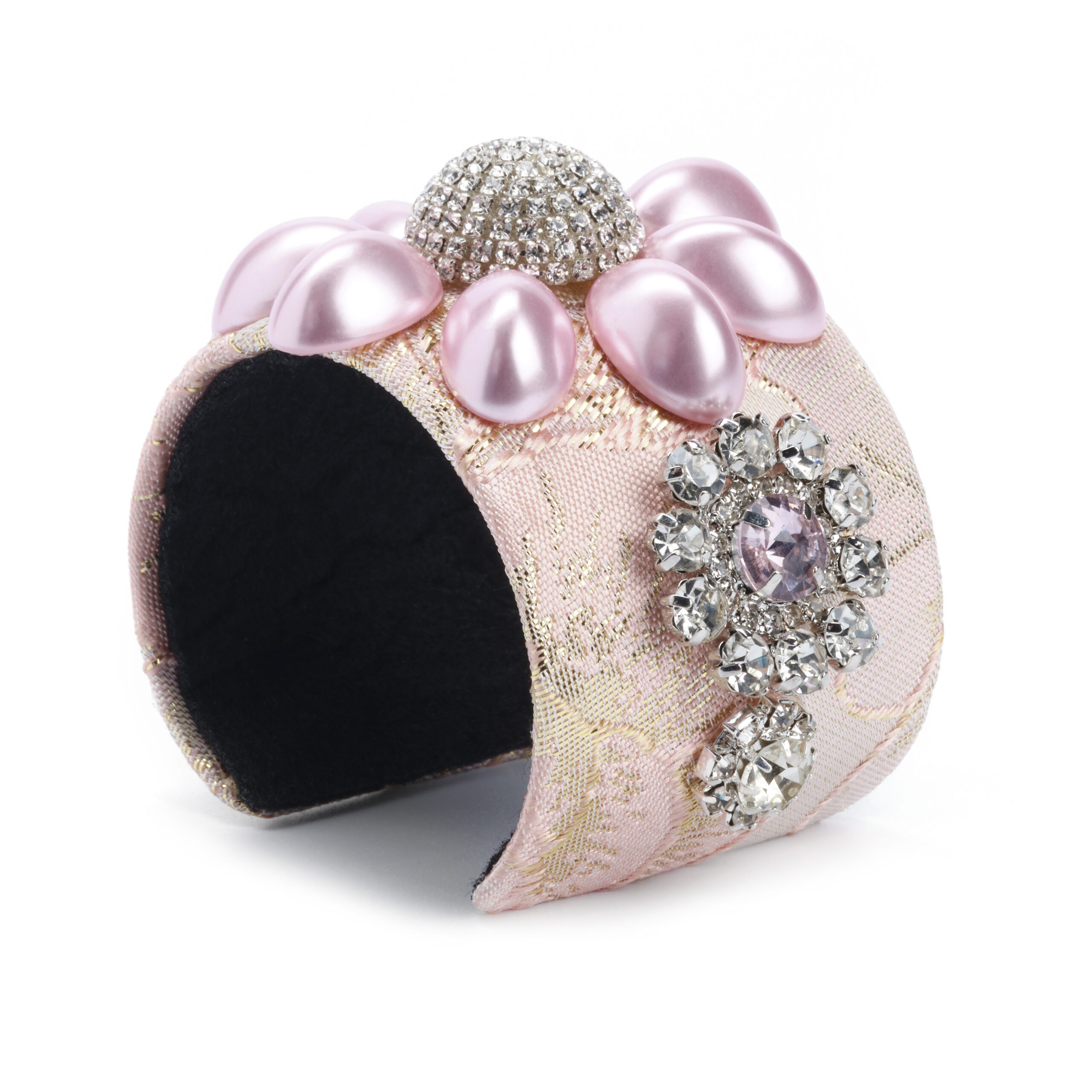 Wear a piece of history with this Baroque metal cuff bracelet, reminiscent of the extravagant jewelry favored by European monarchs. It features brocade made of gold-pink silk fabric and is decorated with acrylic flowers and sparkling rhinestones. It’s a regal and opulent accessory that adds a touch of grandeur to your ensemble.