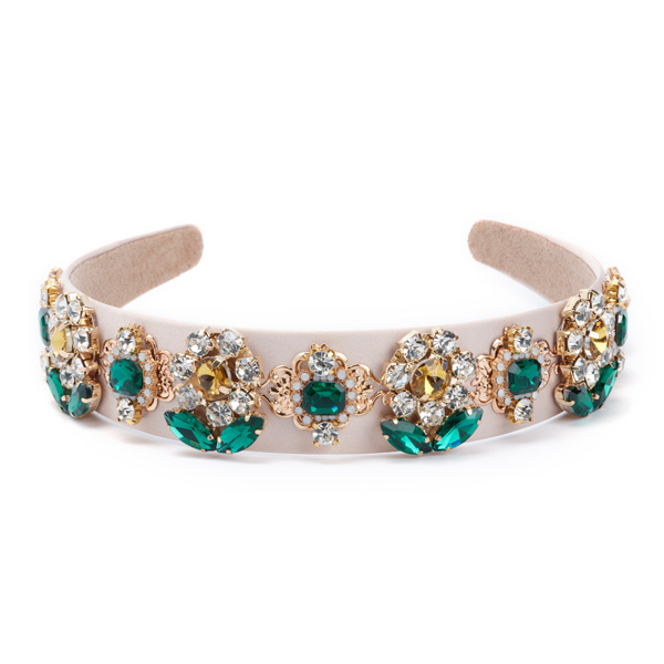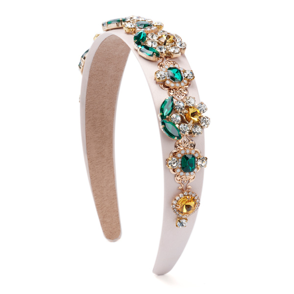 This headband is adorned with stunning glass flowers made of green, yellow, and crystal rhinestone settings. It’s crafted from cream satin fabric, adding a touch of elegance and charm to your ensemble.