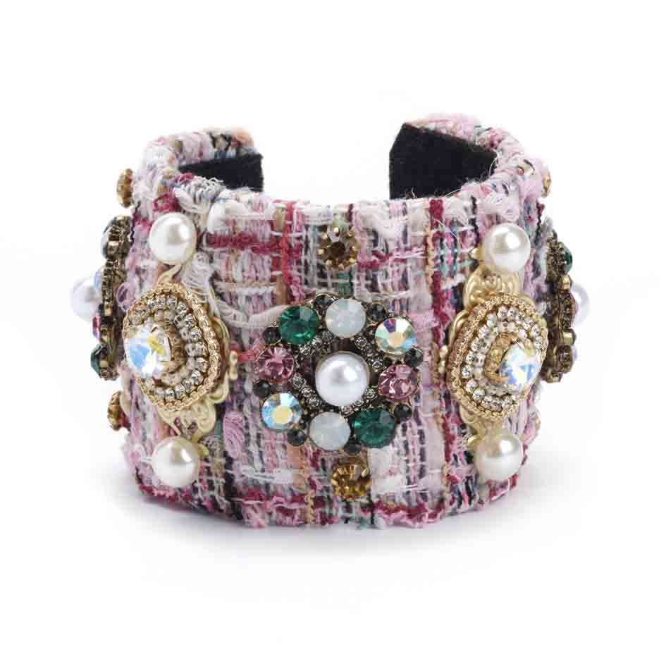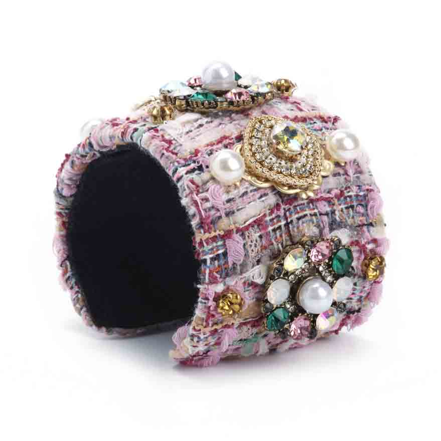 Let your wrist make a statement with this striking metal cuff bracelet made of pink palette tweed. It’s adorned with rhinestones, rosettes and pearls, creating a bold and fashionable accessory that adds a touch of flair to your ensemble.
