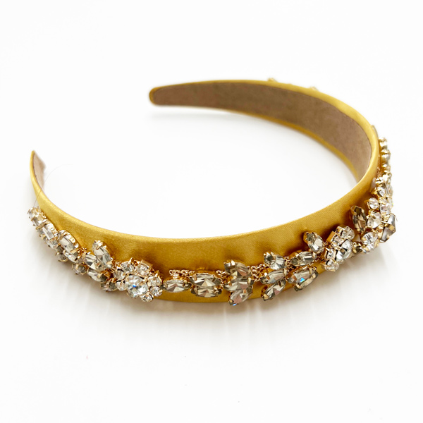 A gorgeous gold satin headband adorned with silver and gold rhinestones provides a polished finish that shimmers beautifully as your head moves.