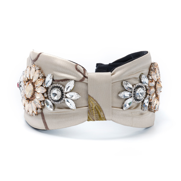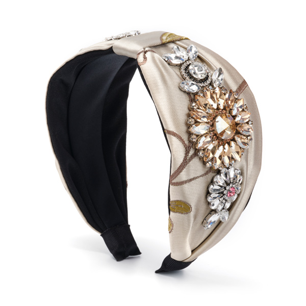 Stunning glass diamonds and grey rhinestones settings adorn this extra wide headband made of embrsaoidered beige fabric with gold threads.