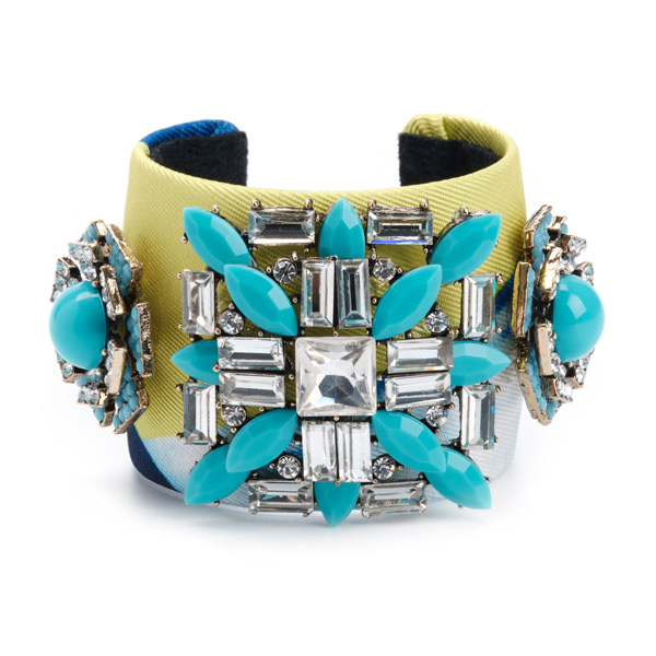 Effortlessly elegant with a fusion of textures and colors. This metal cuff bracelet adorned with jacquard silk fabric in lime and blue, embellished with sparkling rhinestone rosettes and acrylic stones in silver and turquoise, radiates sophistication and style.